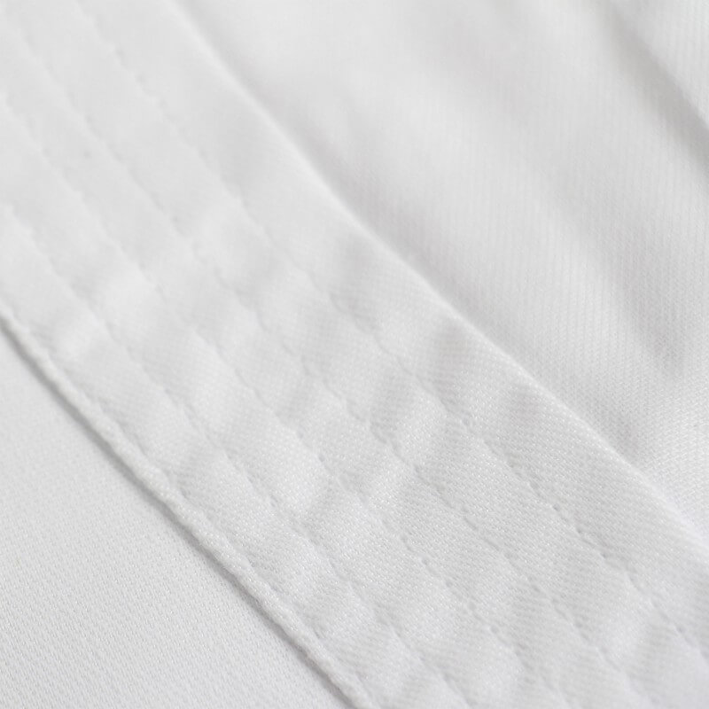 Kimono de karaté EVOLUTION conçu pour les enfants. Système 2 tailles en 1 breveté : un ourlet amovible permet d’adapter la longueur de la veste et du pantalon.