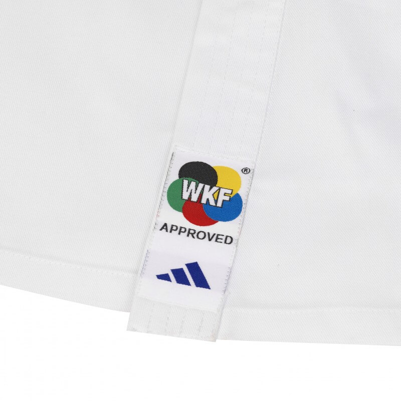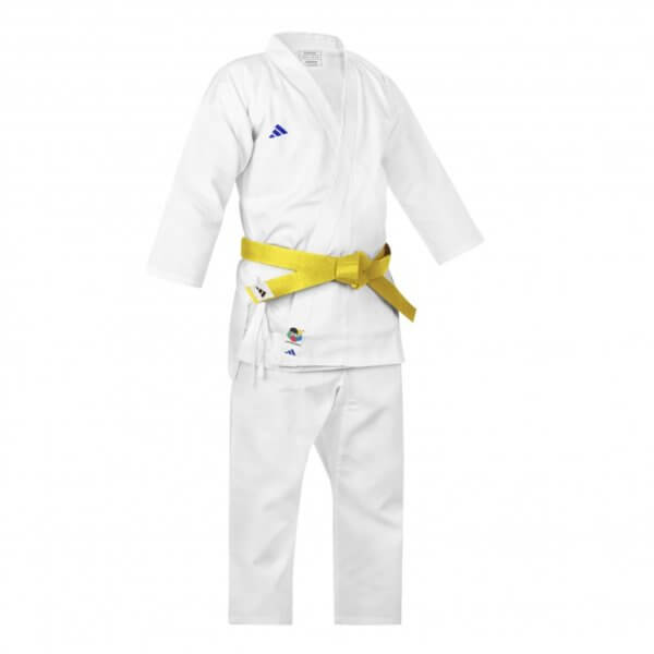 Kimono de karaté EVOLUTION conçu pour les enfants. Système 2 tailles en 1 breveté : un ourlet amovible permet d’adapter la longueur de la veste et du pantalon. Le kimono grandit avec votre enfant. Toile souple et confortable (60 % polyester et 40 % coton). Ceinture élastique sur la pantalo pour un confort optimal et patchs tissés bleu foncé + Décoration WKF.